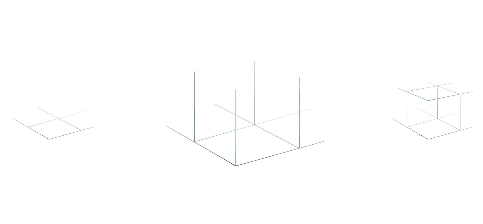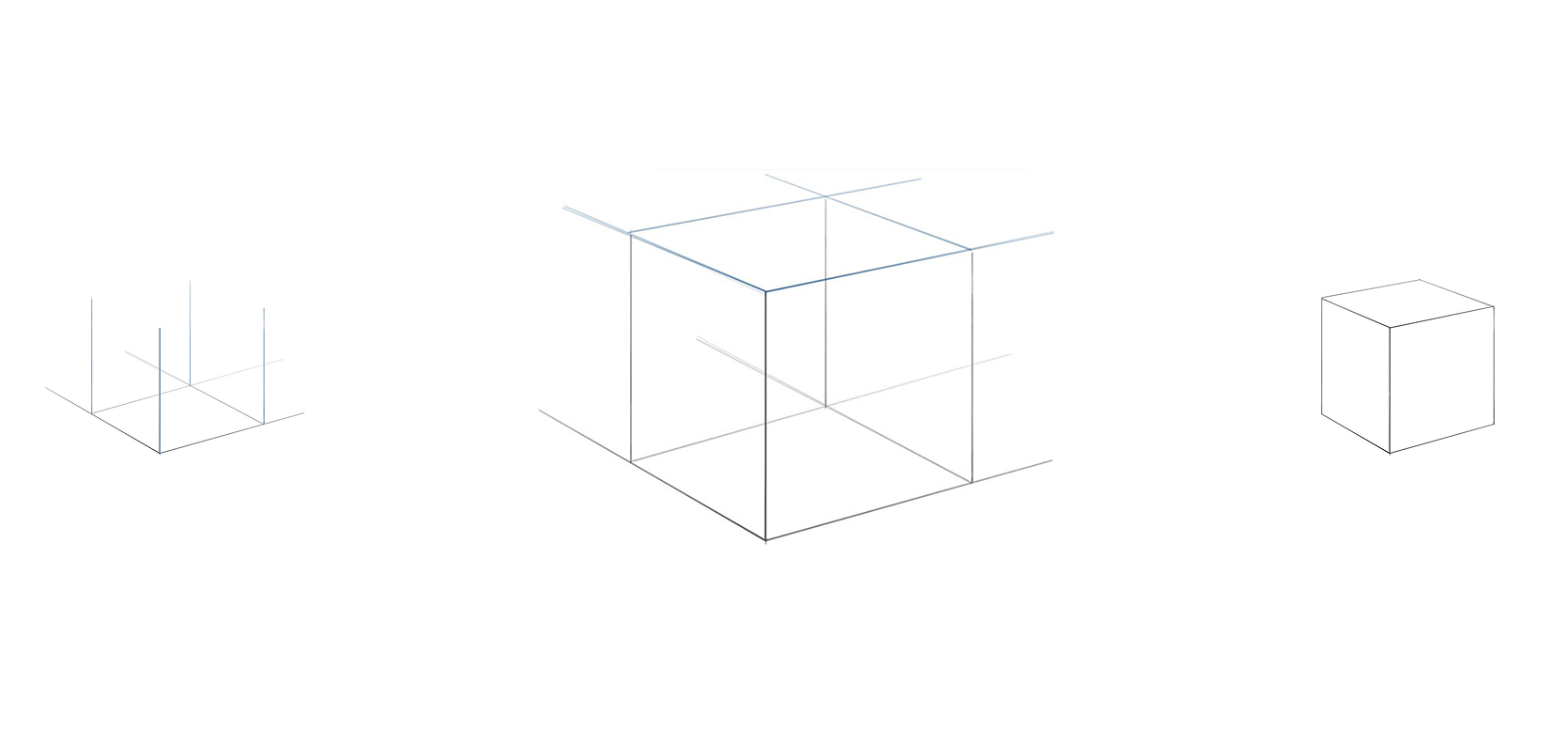 Now, using four straight vertical lines, draw the vertical edges of the cube. According to the rules of aerial perspective, lines located closer to us should be darker and more contrasting than lines located further away from us.